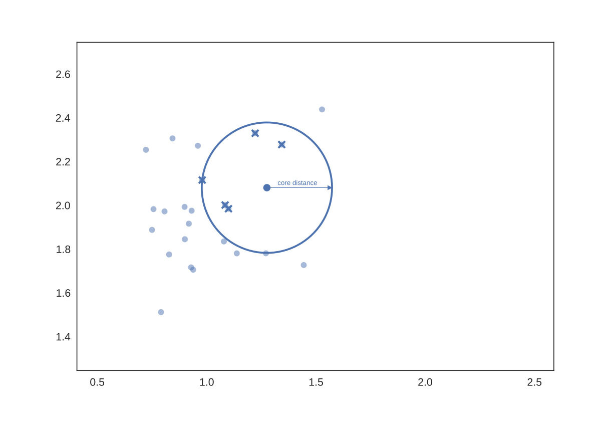 . core distance of point x for parameter k, core_k(x): 점 x에서 k개의 min_cluster_size를 만족시키는 거리