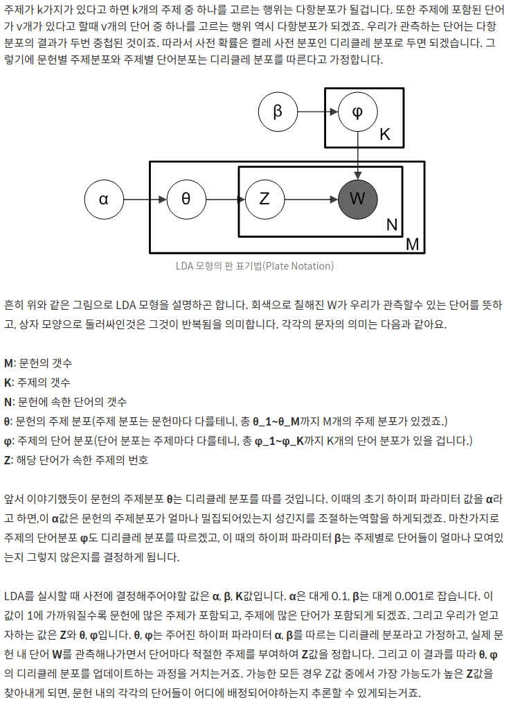 - 이 다항 분포들의 사전 확률을 켤레 사전 분포인 디리클레 분포로 둔다. (즉, 문헌 별 토픽 분포와 주제 별 단어 분포 모두 디리클레 분포를 따른다고 가정한다.)